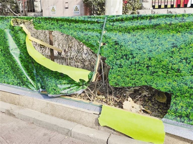 市民刘女士反映,河东区十一经路与十二经路之间的八纬路上,一处人行道绿化带挡风布出现破损,望尽快予以修补。
