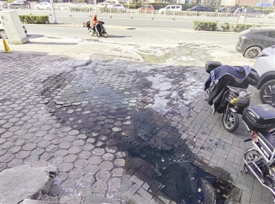 1月16日下午,记者来到南开区广开四马路广云花园底商外,看到四五个污水井正在向外冒着污水,井口都泡在污水里,现场能闻到浓烈的异味,黑绿色的污水已经流到了非机动车道上。