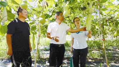 右图:中国农业银行天津大港支行客户经理(图右)到葫芦种植基地走访调研
