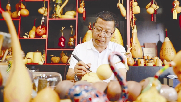 多重身份加持下,徐林成最看重“产业带头人”这一角色。“产业带头人既要会传承手艺,更要有创业思路,让更多人参与进来、赚到钱”,他解释道。这份初心让他在发展中始终平衡着经济效益与社会效益:在种植端,选择最适合当地、最迎合市场的葫芦品种;在加工端,勇于创新实用器,让葫芦文化融入百姓生活;在传承端,坚持免费培训、名师带徒,形成“徒弟带徒弟、代代相传”的传承体系。