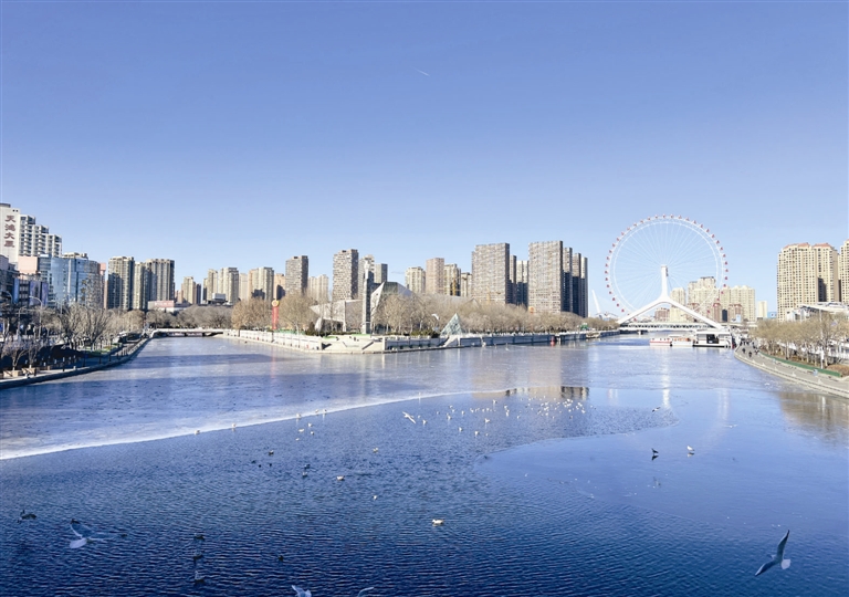 昨日,本市天气晴好,海河三岔河口呈现“半河碧水半河冰”的景致。水面薄冰晶莹,与粼粼波光相映成趣。记者 孙立伟 摄