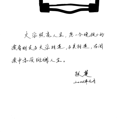 采访中,张楚欣然为《今晚报》读者寄语:“文学照亮人生,愿《今晚报》的读者朋友与文学相遇,与美相遇,在阅读中享受斑斓人生。”52岁的张楚,正处于一个黄金年龄,关于天津、创作以及未来,充沛的情感让他的回答炽烈。