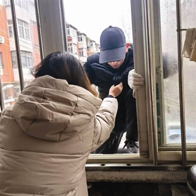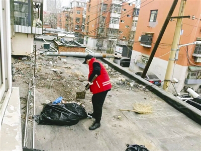 1月20日上午,网格员与物业人员手持扫帚、铁铲、垃圾袋,化身“环境美容师”。底商屋顶距离地面高度在五六米左右,由于底商屋顶离着崔奶奶家窗户比较近,只能从崔奶奶家的窗户进入,窗口空间狭窄,给清理工作带来了不小挑战。