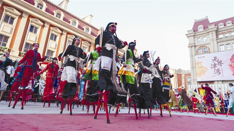 2026年元旦假期,海河之畔的津湾广场以一场名为“无界津湾”的跨界艺术盛宴,为津门新年写下了浓墨重彩的开篇。持续三日的文化盛事,主打“无界”理念,在打破艺术门类边界的同时,也完成了一场传统津派文化与现代表达方式的精彩对话。从化身“天津卫”字样的百年高跷方阵,到融合非遗剪纸的国潮时装秀;从津籍大师作品的联袂展演,到五大剧种走下舞台的沉浸互动……传统绝活儿在创新编排中焕发新生,历史文脉借时尚语言引发广泛共鸣。