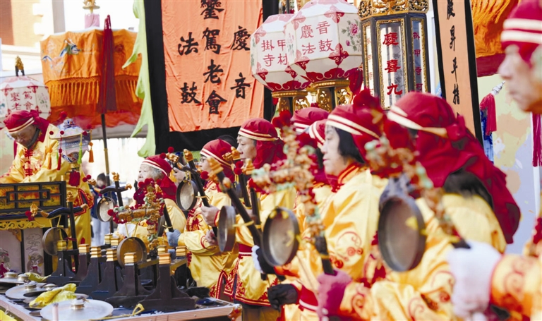 津籍非遗瑰宝——挂甲寺庆音法鼓銮驾老会的雄浑鼓点萦绕在津湾广场。这支于2008年获评国家级非遗的津门老会,传承超三百年,依托明崇祯后妃赐予挂甲寺的半套仪仗执事建会。銮驾含日月龙凤扇、九曲黄罗伞,搭配鼓箱、高照、帅旗等组成规整宝驾,道具华美、表演精湛,是津派民俗文化核心代表之一。法鼓表演隆重开场后,特邀来津的河北沧州舞狮助阵,10对雄狮身姿矫健,红鬃金鳞映天光,冀津非遗同台辉映,瞬间点燃全场热情。