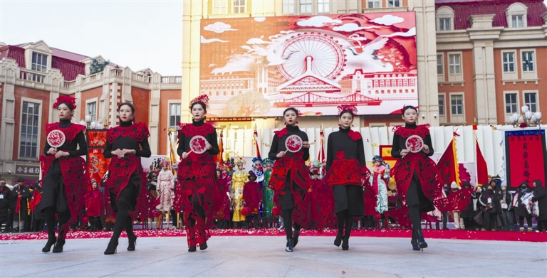 五家老会头棒皆是武松形象,服饰化妆既统一又各具特色,队形变换中领队挥棒,百人高跷腾跃间骤然定格,化作方正大气的“天津卫”之“卫”字阵形,尽显津派高跷的豪迈磅礴。本场演出最精彩绝伦之处,莫过于高跷与时装的极致跨界:没有常规的音乐伴奏,模特身披以天津非遗剪纸元素为设计灵感的中国红时装登台,伴随着百人高跷队锣鼓手现场击打的铿锵鼓点迈步走秀。那一抹中国红代表中国年,时尚与年俗紧紧相扣,完美呼应了传统文化与现代艺术的无界融合;时装上的剪纸纹样藏着杨柳青年画童趣与津派窗花精巧,将剪纸艺术解构重组,以镂空、刺绣、数码印花等工艺融入时装,刚劲锣鼓配雅致台步,豪迈高跷映衬着夺目的中国红,古今碰撞、刚柔交织,缔造震撼跨界高光,全场喝彩连连。