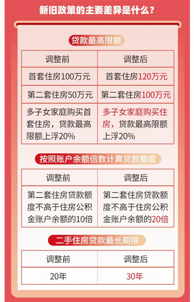 答:提高贷款最高限额。将首套、第二套住房贷款最高限额分别由100万元、50万元提高至120万元、100万元。养育两个及以上子女且至少一个子女未成年的,首套、第二套住房贷款最高限额分别由120万元、50万元提高至144万元、120万元。