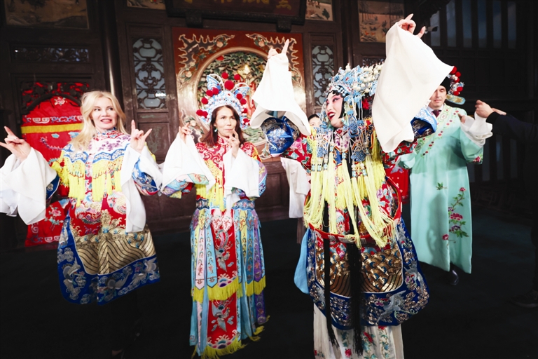 当天下午,一行人又来到了雕梁画栋的广东会馆。舞台上,京剧演员水袖轻扬,亮开嗓子唱出经典唱段;舞台下,八仙桌整齐排开,十八街麻花、蛤蟆吐蜜等特色津味儿小吃错落摆放。使节及嘉宾们时而凝神欣赏,时而低头拈起一块小吃品尝,时而拿出手机记录精彩瞬间。
