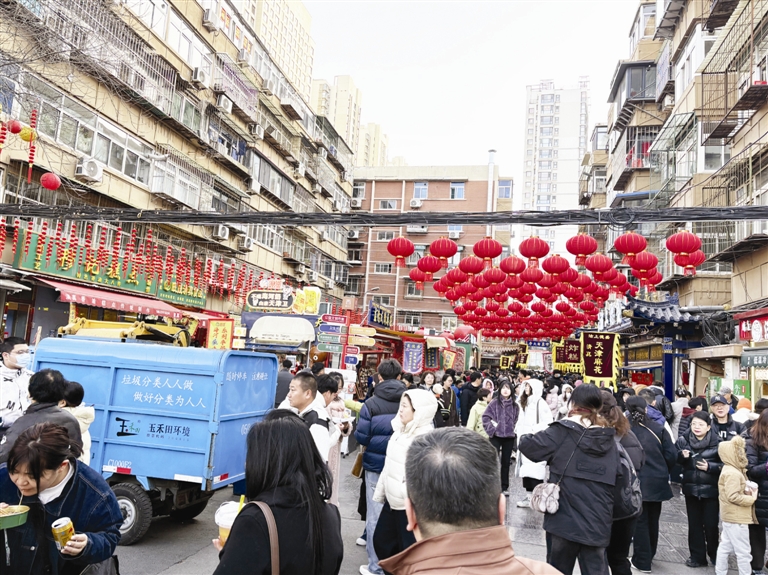 8时30分,天津西北角特色街区入口前人头攒动,年味拉满的美食地标人声鼎沸。街巷间,商户门前“一户一景”的装饰尽显年味。煎饼果子的焦香、锅巴菜的醇厚、现炸炸糕的酥脆交织弥漫。来自各地的游客手持美食,在排队间隙拍照打卡,南腔北调的交谈声,勾勒出最鲜活的节日烟火气。