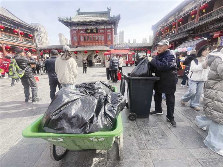 戏楼前的广场是游客休憩、品尝美食的区域,十余个大型垃圾桶分散摆放,不少游客在此品尝茶汤、煎饼果子等天津特色小吃。一名保洁员正熟练地更换垃圾袋,将满袋垃圾扎紧搬上清运车,再快速套上新袋,动作十分麻利。“把我负责区域的垃圾桶全部换一遍,差不多要半个小时,刚换完没多久,袋子又满了,只能反复忙活。”保洁员说。