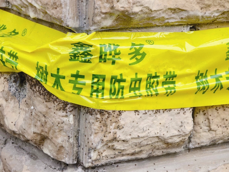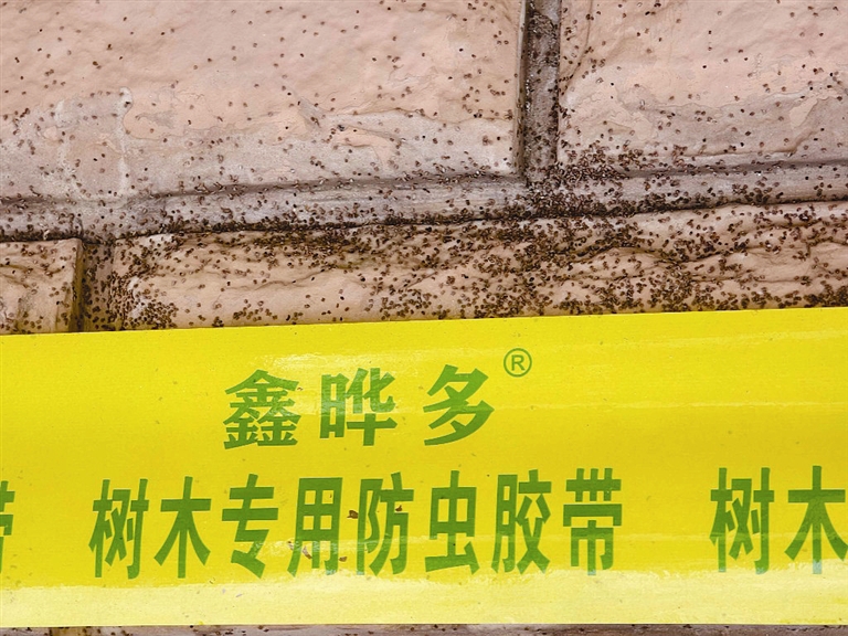 这位负责人表示,目前,按照专家指导,采取“物理阻隔+药剂防治”相结合的方式开展综合治理。在有虫害的树木、楼体上缠绕黄色胶带,主要是阻隔草履蚧向上爬。光滑和有黏性的胶带会将大部分草履蚧拦截在胶带以下,利于防治。另外,专家还配比了一定量的药物,按时按量喷药,也会起到一定治理作用。