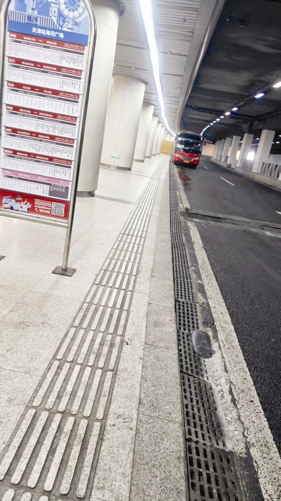 2月22日,记者来到现场,由河东区赤峰桥方向去往建国道方向的海河东路隧道内设有天津站海河广场公交站,有868路等7条公交线路在此停靠。记者看到在人行道下的路面上,埋设有数十米的排水井箅。在紧邻公交站牌下的两个排水井箅与柏油路面的连接处有明显的水泥修补痕迹。