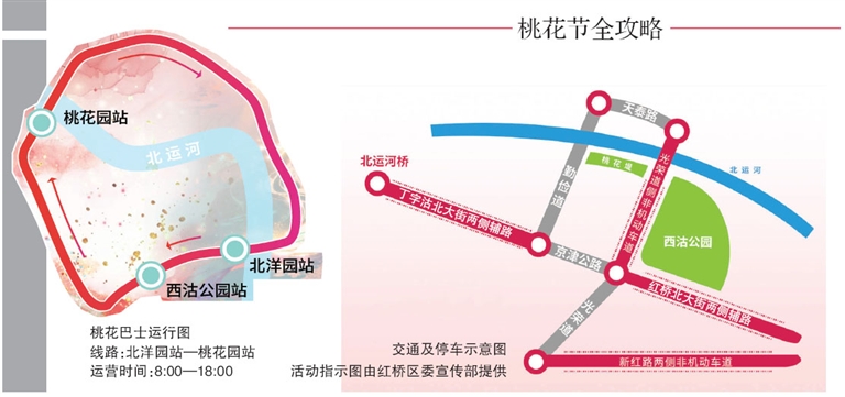此外,今年桃花节还会推出小环线巴士,串联桃花园、北洋园、西沽公园等站点,免费接送市民游客。