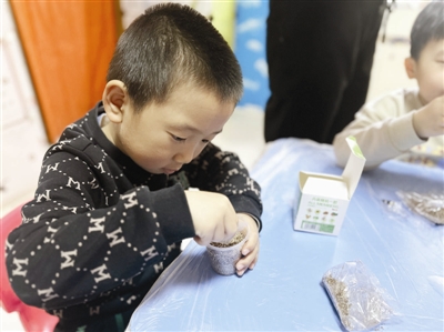 昨日,红桥区泉春里社区联合阳光明媚学习园地,为辖区学龄前幼儿举办了一场指尖盆栽种植活动。
