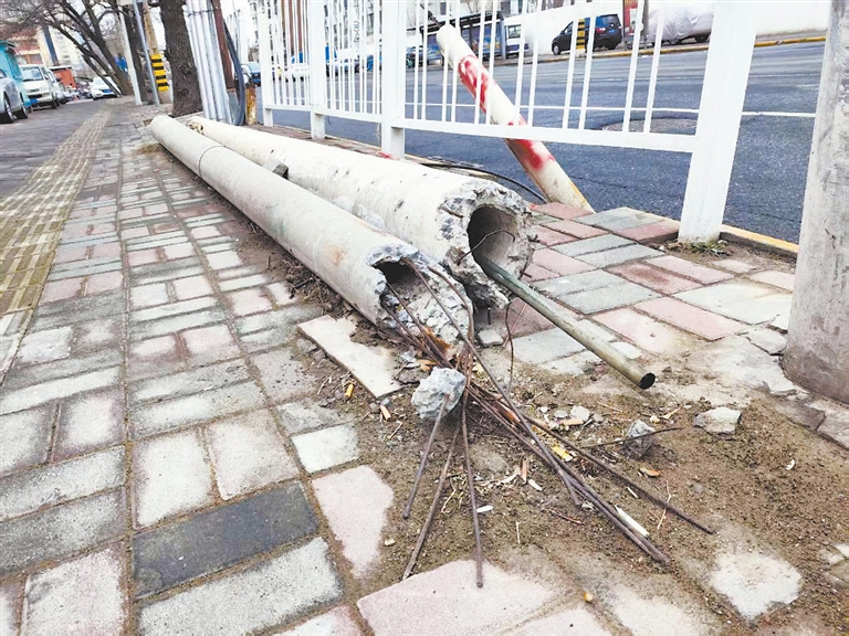 近日,记者来到六纬路与大直沽中路交口看到,在道路交口处,两根倾倒的线杆“躺”在人行道的盲道旁,线杆内的钢筋暴露在外有半米多长,行人稍不注意就会被线杆或钢筋绊到。记者在现场看到,线杆上没有明显的产权单位标识。周边居民表示,线杆搁置数月,既影响市容也存在安全隐患。记者先后联系多个部门,均无法快速认定权属。