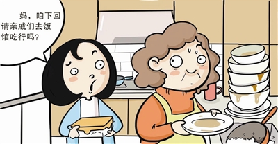 老妈可怜巴巴地看着小娜:“那你说以后来客人怎么办?”小娜说,如果是很亲的、走动频繁的亲戚,只来两三个人的话,可以考虑在家里请客,但是如果是那些拖家带口的,必须去饭店吃,家里经不起他们折腾。老妈考虑了一下,觉得小娜说得有道理,就点头同意了。