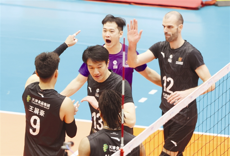 2025—2026赛季男排超级联赛季后赛第五轮,面对常规赛头名河北男排,天津食品集团男排最终在主场经历5局鏖战后取胜,提前锁定了C组中的一个四强席位。本场比赛,首发并主打自由人位置的易腾龙(图右二)顶住了重重压力,赛后,他收获了本场比赛的“最佳表现奖”。