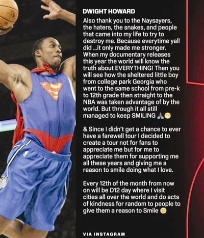 北京时间昨天,前NBA著名中锋霍华德在个人社交媒体发布长文,宣布正式退役,并表示今后将把更多时间投入到家庭与公益事业中。