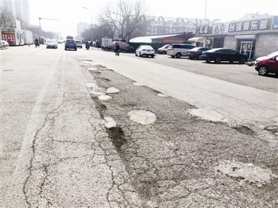 3月15日,记者前往现场实地探访。该段慧捷路地处京芦线与津蓟高速之间,全长不足400米,道路沿线除了金隅金玉府小区外,还有不少商铺、餐馆。道路规划为双向四车道,但因路边违规停车现象突出,实际仅余双向两车道可供通行。记者在现场看到,这段路面坑洼破损问题确实十分严重。这些坑洞虽面积不大,但常三四个连续排布,记者用手指测量,坑深将近一指。一些车辆驶过来不及躲避,碾过坑洞时发出“咯噔”声。记者随机走访了几位市民,他们表示该问题已持续多年,之前相关部门进行过修补,但很快坑洞又会重现。