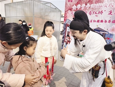 游客们兴致盎然、流连忘返。身着精美汉服的互动演员手持桃花枝与诗词牌在人群中穿梭,温婉大方、互动亲切,与市民即兴对诗、合影留念,不少小朋友追着互动演员提问,大人孩子一同沉浸在国风意境之中。