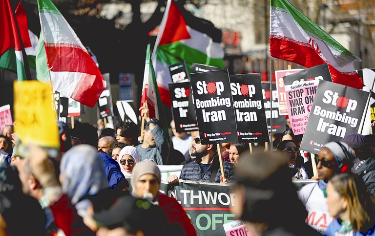 3月21日,人们在伦敦参加集会,抗议美以对伊朗发动军事打击。 新华社记者 李颖 摄