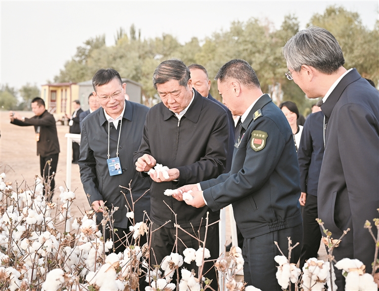 中央代表团来到一师阿拉尔市十团十八连机采棉作业现场,调研兵团现代化农业生产及农业机械装备制造情况,观摩机采棉现场作业。何立峰指出,要发挥好兵团土地规模化、集约化优势,大力推进科技创新,塑造棉花品种新优势,推进棉花上下游产业链发展,在保障我国重要农产品供给等方面发挥更大作用。
