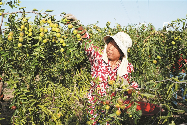 10月5日,在三师五〇团二连冬枣园里,一名职工采摘丰收的冬枣。今年,三师图木舒克市依托光照资源优势,种植冬枣约1万亩,鲜果产量可达6000余吨。兵团日报全媒体记者 常丫丫 摄