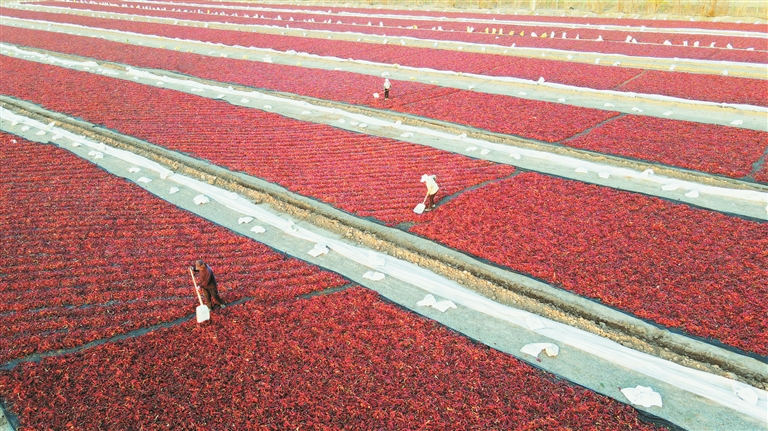 10月8日,六师军户农场三连职工在晾晒辣椒。今年,军户农场种植各种特色辣椒6000多亩。当前,种植户抓住晴好天气做好采收、晾晒、销售等工作,预计平均每亩辣椒收入6000多元。 王德江 陈文洁 摄