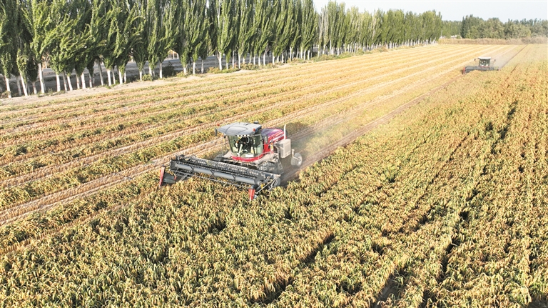 10月5日,在一师十团农田里,职工驾驶收割机收获谷子。今年,十团种植谷子1.9万亩,预计亩产490公斤。目前,该团抢抓晴好天气,加紧采收、晾晒谷子。 黄蓓 摄