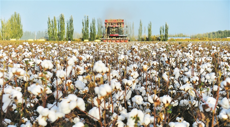 10月19日,采棉机在一师十团十二连棉田里采收新棉。一师阿拉尔市今年种植棉花203.7万亩,预计籽棉平均亩产470公斤。眼下,该师市进入新棉盛采期,职工群众抢抓晴好天气抓紧采收、交售新棉,确保朵絮归仓。孙国权 摄