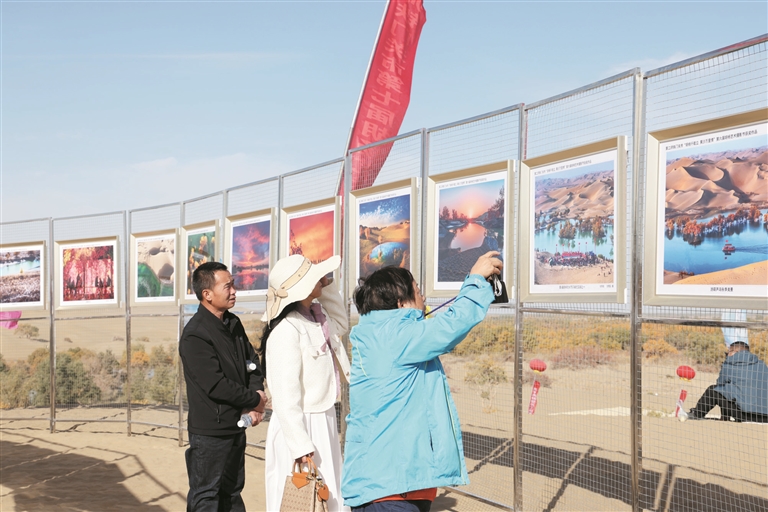 10月19日,二师铁门关市第七届胡杨艺术摄影节在三十三团葫芦岛景区开幕。图为游客观赏摄影作品。活动期间,摄影爱好者将在三十三团开展采风活动,用镜头捕捉自然美景,进一步提高景区知名度,推动团场文旅产业融合发展。 兵团日报全媒体记者 张贝 通讯员 魏怀娟 摄