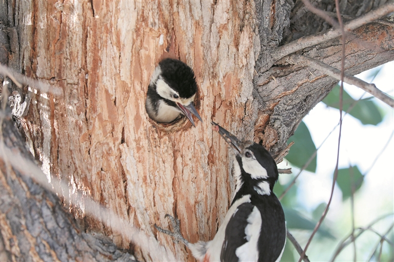 在七师一二八团居民区一株胡杨上,啄木鸟为雏鸟喂食(资料图片)。近年来,一二八团不断加大生态环境保护力度,在团场繁衍生息的鸟类种类和数量大幅增加。 兵团日报常驻记者 张西安 摄