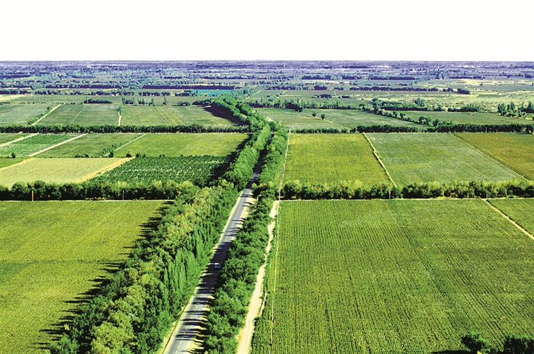 航拍的八师一五○团人工林(资料图片)。一五○团通过大规模人工造林和封沙育林,将绿洲向沙漠腹地推进60多公里,创造了“沙海半岛”的人间奇迹,成为全国防沙治沙综合示范区。 兵团林业和草原局 提供
