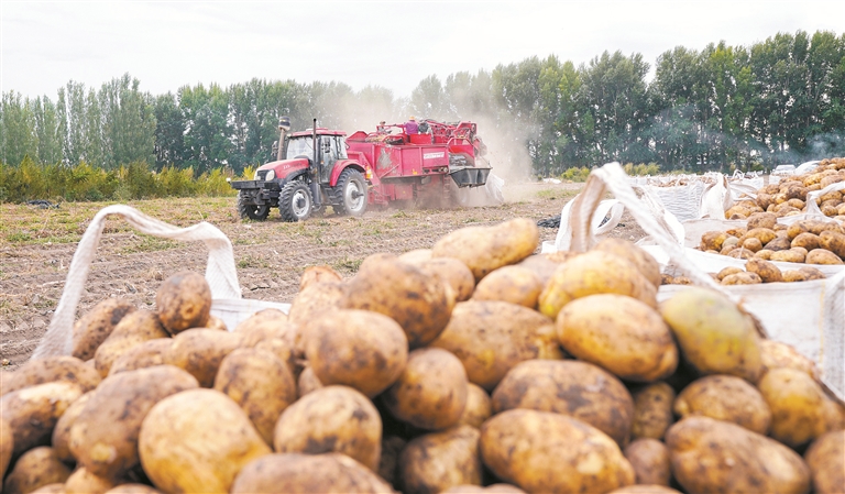 10月5日,十师一八五团职工驾驶土豆收获机采收土豆。近年来,十师北屯市持续优化农业产业结构,因地制宜发展订单农业,通过“企业+订单+农户”经营模式,大力发展土豆种植业,助力职工增收致富。今年,该师市通过引进推广新品种、强化科学种植管理以及病虫害防治等,进一步提升土豆的产量和品质,种植土豆亩均纯收入能达到1000元以上。兵团日报常驻记者 李正虎 摄