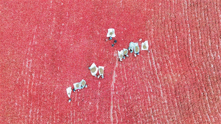 10月15日,八师一四二团种植户在晾晒丰收的辣椒。今年,一四二团辣椒种植面积约4.2万亩,干椒平均亩产近600公斤,鲜椒平均亩产达1.5吨。郭志鹏 摄