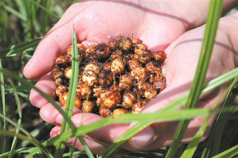 10月9日,三师五十四团职工展示收获的油莎豆。今年,五十四团共种植油莎豆1.61万亩,最高亩产预计可达800公斤。 贺跃 邓紫瑶 摄