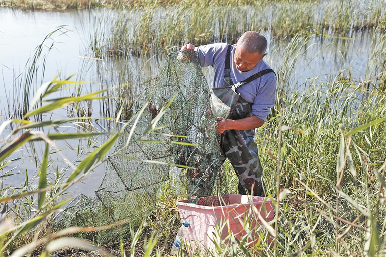 10月11日,在四师六十八团十连龙虾标准化养殖繁育示范基地,工作人员打捞澳洲淡水龙虾。今年,该基地从海南、广东等地引进18万尾澳洲淡水龙虾进行试养,目前已实现销售收入50余万元。杨俊钦 摄