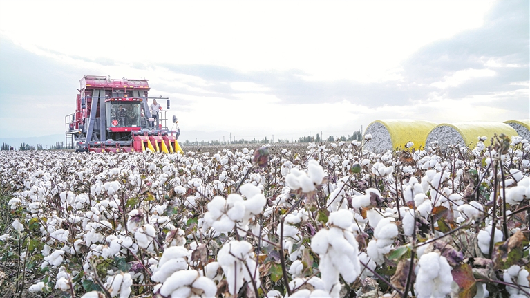 10月15日,采棉机在五师九〇团棉田里采收新棉。眼下,五师双河市70万亩棉花进入采收期,种植户抢抓农时,有序开展采收工作,确保棉花朵絮归仓。 兵团日报全媒体记者 陈洋 摄