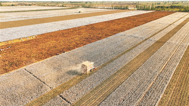 10月23日,在三师四十五团棉田里,大型采棉机采收新棉。眼下,三师图木舒克市105.78万亩棉花采收已超过七成,日采棉花2万多亩,预计10月底完成采收任务。目前,各团场、连队积极与棉花加工企业对接,开辟新棉交售绿色通道,为种植户丰产增收提供有力保障。 兵团日报全媒体记者 陈洋 邵明辉 摄