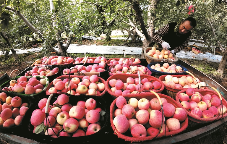 10月23日,在一师六团二连果园里,一名职工将刚刚采摘的苹果码放整齐。今年,一师阿拉尔市共种植冰糖心“红富士”苹果13.2万亩,预计总产量可达54.9万吨,目前已进入采摘期,产品将销往北京、上海、浙江等省市及中亚地区市场。 兵团日报全媒体记者 王志清 摄