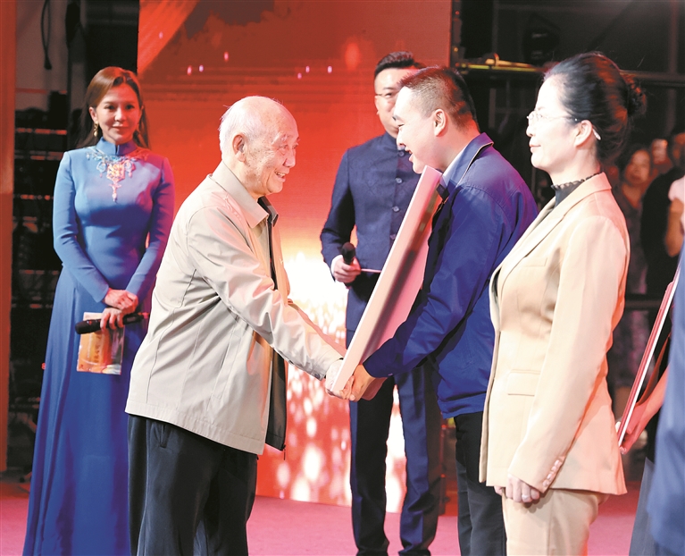 9月8日,2024绿风诗歌晚会暨“中国诗歌之城”八师石河子市第二届诵读大赛颁奖晚会在石河子明珠剧场举行。著名诗人杨牧(左二)为获奖单位颁奖。 王艳 摄