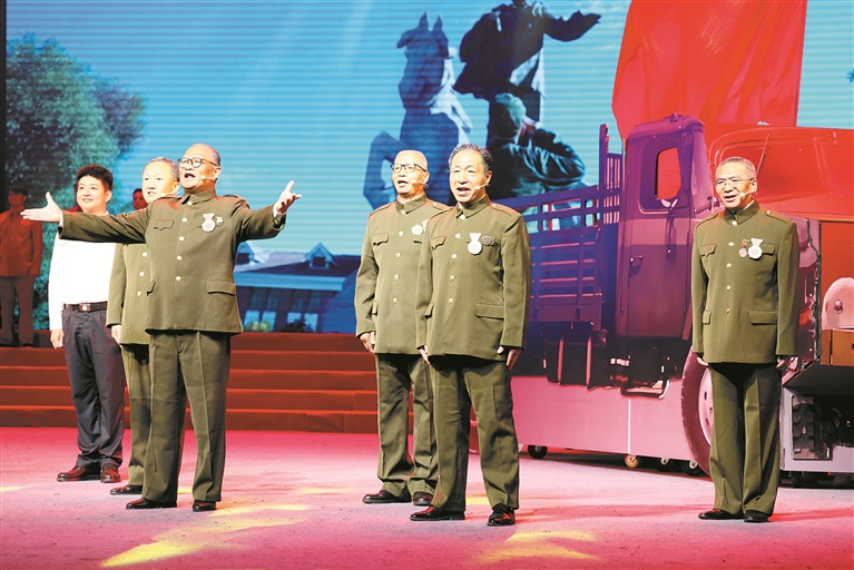 “红旗猎猎征途漫漫,军号声声催人向前,70多年前的石河子,因为我们爷爷的到来换了人间……”