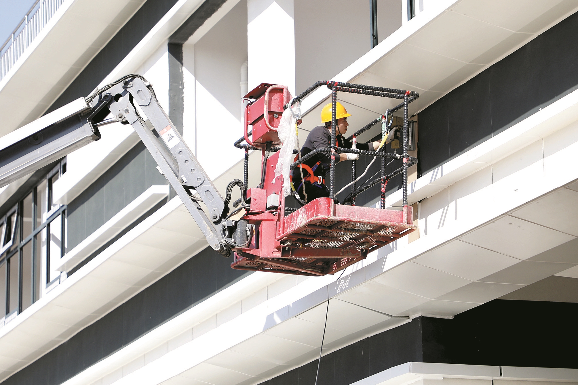 10月30日,在可克达拉市宏远惠农智慧物流园项目建设现场,工人进行建筑外立面施工作业。该项目总投资8.8亿元,分两期建设,一期项目预计11月底完工,计划打造区域规模最大的农机具、汽车、建材物流园。今年前三季度,四师可克达拉市开复工项目293个,完成投资87.7亿元,同比增长8.6%。 杨俊钦 摄影报道