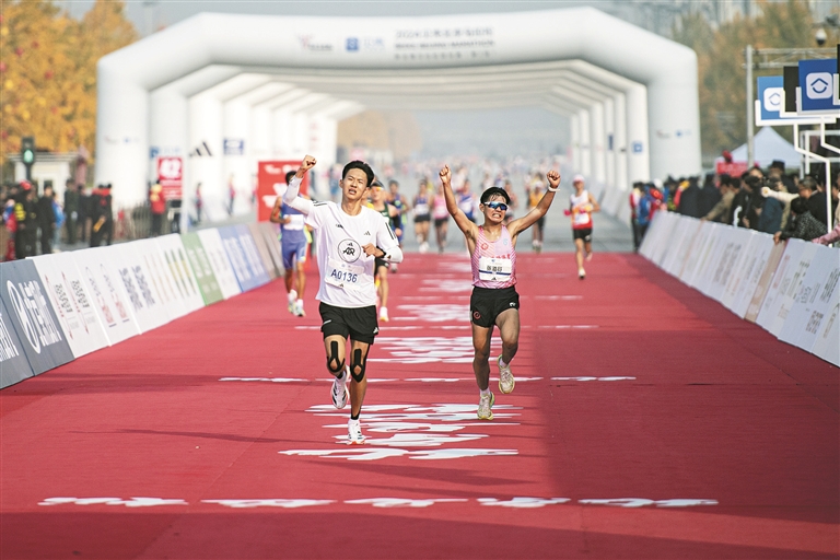 图② 11月3日,参赛选手冲向位于奥林匹克公园的终点线。当日,2024北京马拉松赛暨全国马拉松锦标赛(第3站)在京举行。