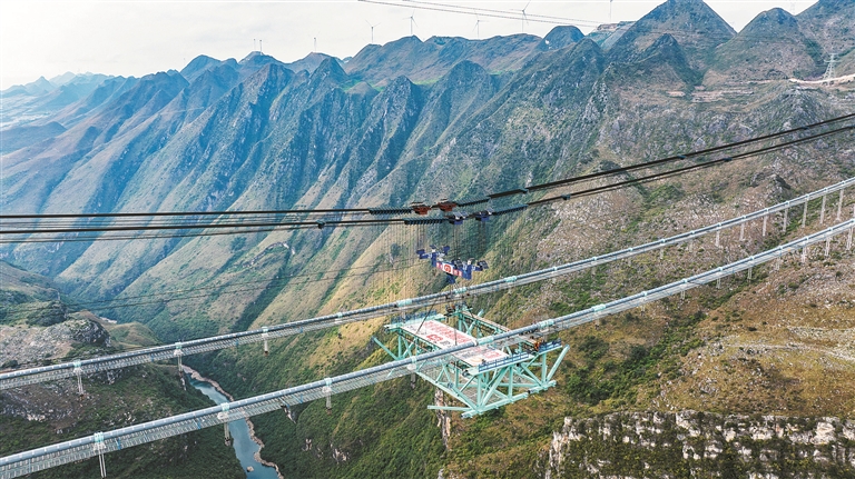 11月4日,在建世界最高桥——贵州花江峡谷大桥建设取得重要进展:随着缆索吊机将重约215吨的首件钢桁梁精准吊装至指定位置,大桥施工进入新阶段,为明年通车运营奠定了基础。