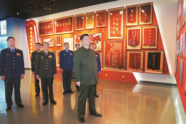 随后,习近平参观了空降兵军军史馆。该军是一支历史厚重、功勋卓著的英雄部队,革命战争年代历经战火硝烟洗礼,抗美援朝战争上甘岭战役中打出了国威军威,和平建设时期出色完成一系列重大任务,涌现出一大批英雄集体和英模人物。习近平仔细观看展陈,认真听取讲解。他叮嘱大家,要用好红色资源优势,教育引导官兵把光荣传统弘扬好,争做新时代英雄传人。