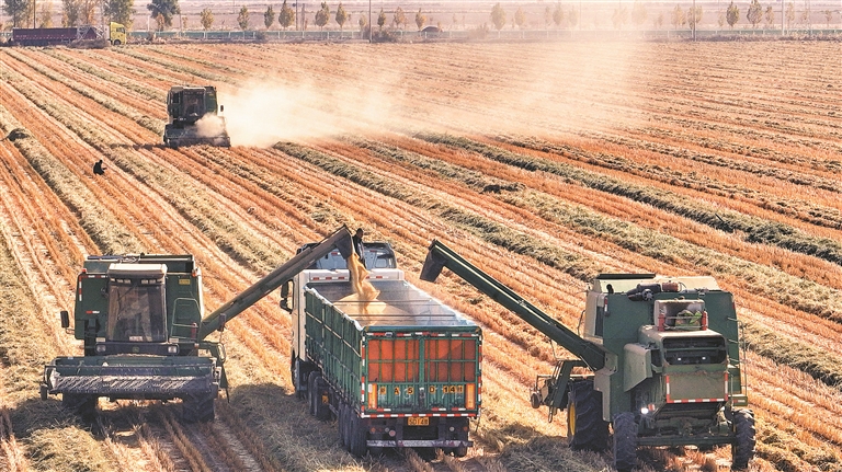 11月3日,收割机在三师四十四团谷子地里作业。今年,三师图木舒克市2.4万亩谷子获得丰收,种植户抢抓晴好天气收割、拉运谷子,田间地头一派丰收景象。 兵团日报全媒体记者 陈洋 常驻记者 陈明珠 摄