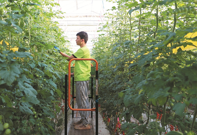 10月29日,在可克达拉市润泰农业科技开发有限公司温室大棚内,工作人员察看番茄长势。今年,该公司种植串收番茄210亩,通过采用智能控制系统以及无土栽培、水肥一体化、熊蜂授粉等先进技术,使串收番茄生产成本较传统种植模式降低了40%,产量也得到进一步提高。5月份以来,该公司采收串收番茄近600吨,实现销售收入近800万元。王东 摄