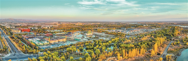 城区向南,一直抵达伊犁河岸。最南端的珠江路、赣江路、滨河路,不是平直的,而是构成一道弯弯的弧形,与迎宾大道交叉,左右对称,构成一副弯弓待发的姿态,充满着进取的动感。