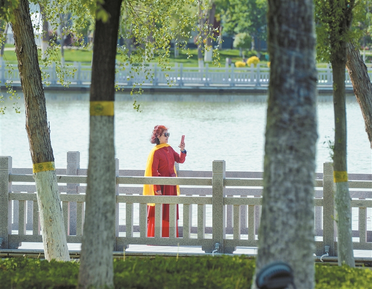 城市的街道上,多条道路是快车道、慢车道、人行道三道分离,都有绿树相隔。尤为突出的是,无论大树小树都排列非常整齐,横平竖直,斜线也直,就像仪仗队排列在长达8.6公里的迎宾大道上。除了绿色之路外,全城还有29个大小不同的主题公园和一个富有诗意的朱雀湖,将可克达拉拥抱在五彩缤纷的图画中。